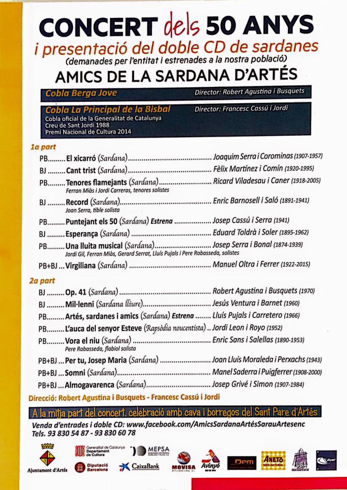 Aquest dissabte els Amics de la Sardana d'Artés celebraran el seu 50è aniversari. Entre d'altres actes, realitzen un concert a dues cobles, on hi participarem juntament amb la cobla Principal de la Bisbal.